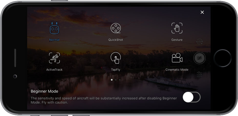 Tripod Modu: Tripod Modunda maksimum uçuş hızı 2,2 mil / sn (3,6 km / s) ile sınırlıdır. Daha akıcı daha kontrollü hareketler için çubuk hareketlerine duyarlılık da azalır. Bu mod sadece aydınlatma koşulları iyi olduğunda ve drone güçlü bir GPS sinyaline sahip olduğunda kullanılabilir.