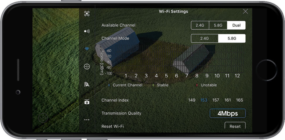 Wi-Fi ayarları ekranı size Wi-Fi sinyalinin gücünü gösterir ve herhangi bir parazit varsa, bunu 2,4 GHz ila 5,8 GHz arasında değiştirmek için de kullanabilirsiniz. Ayrıca Wi-Fi ayarlarını sıfırlayabilir ve kullanıcı adını ve şifresini değiştirebilirsiniz. (Mavic, Spark)