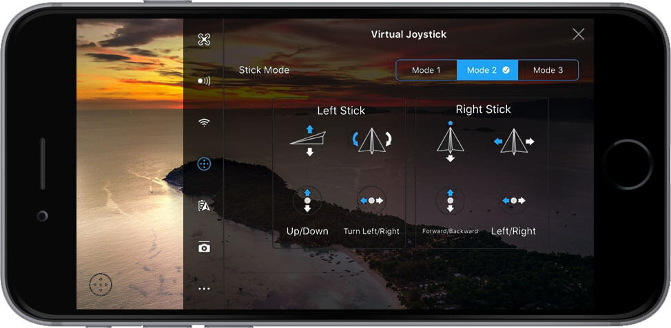 Uçağınızı nasıl uçuracağınız için çubuk modunu seçebileceğiniz yer burasıdır; Varsayılan joystick modu hem uzaktan kumanda hem de sanal joystick için 2’dir. Şu anda sadece Mavic ve Spark, sanal oyun çubuklarını destekliyor.